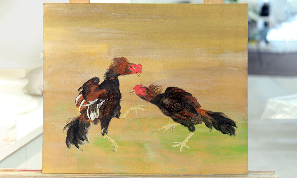 日本の美意識が育んだ独自の手法、明るく上品な色調は主に岩絵具と膠によって生まれます。鉱物を細かく砕いて作る岩絵具は美しい色彩と共に鉱物の実在感を持つのも特徴。また、和紙や絹など美しい肌合いを持つ基底材が、日本画の美しさをより際立たせます。