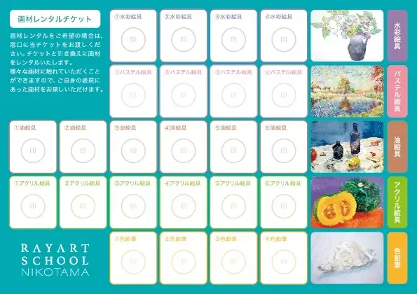 月謝制でご入会いただいた方に画材を一通り試すことができる無料チケットをお渡ししています。ご自身に合った画材をぜひ見つけてください!